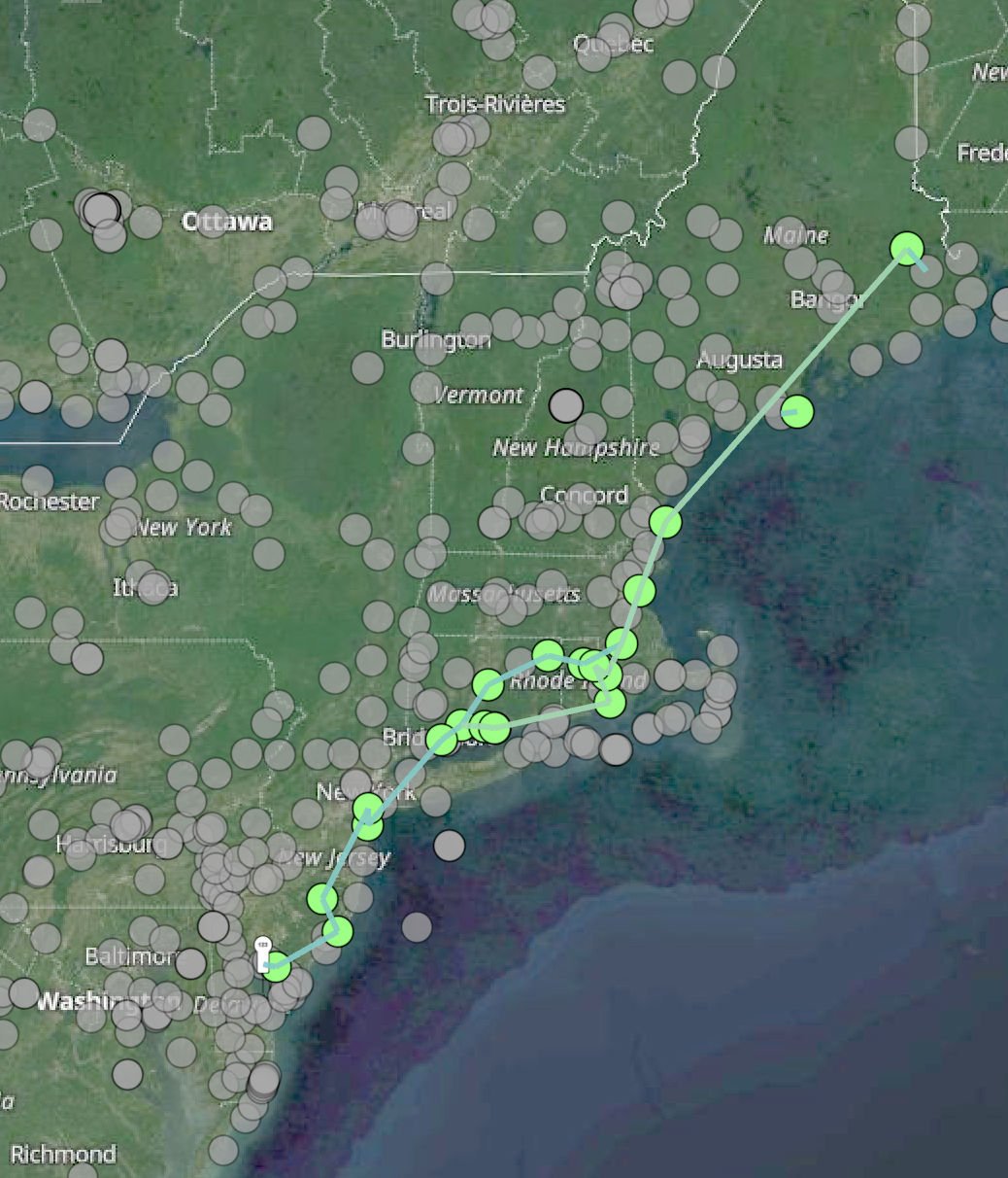 After bulking up, the bird headed north. On May 30, 2025, its signal was picked up by the Motus tower at the Sound School. This detection provided a "snapshot" of its migration: it was moving quickly along the coast, likely flying under the cover of night or at high altitudes, using the coastline as a navigational guide.